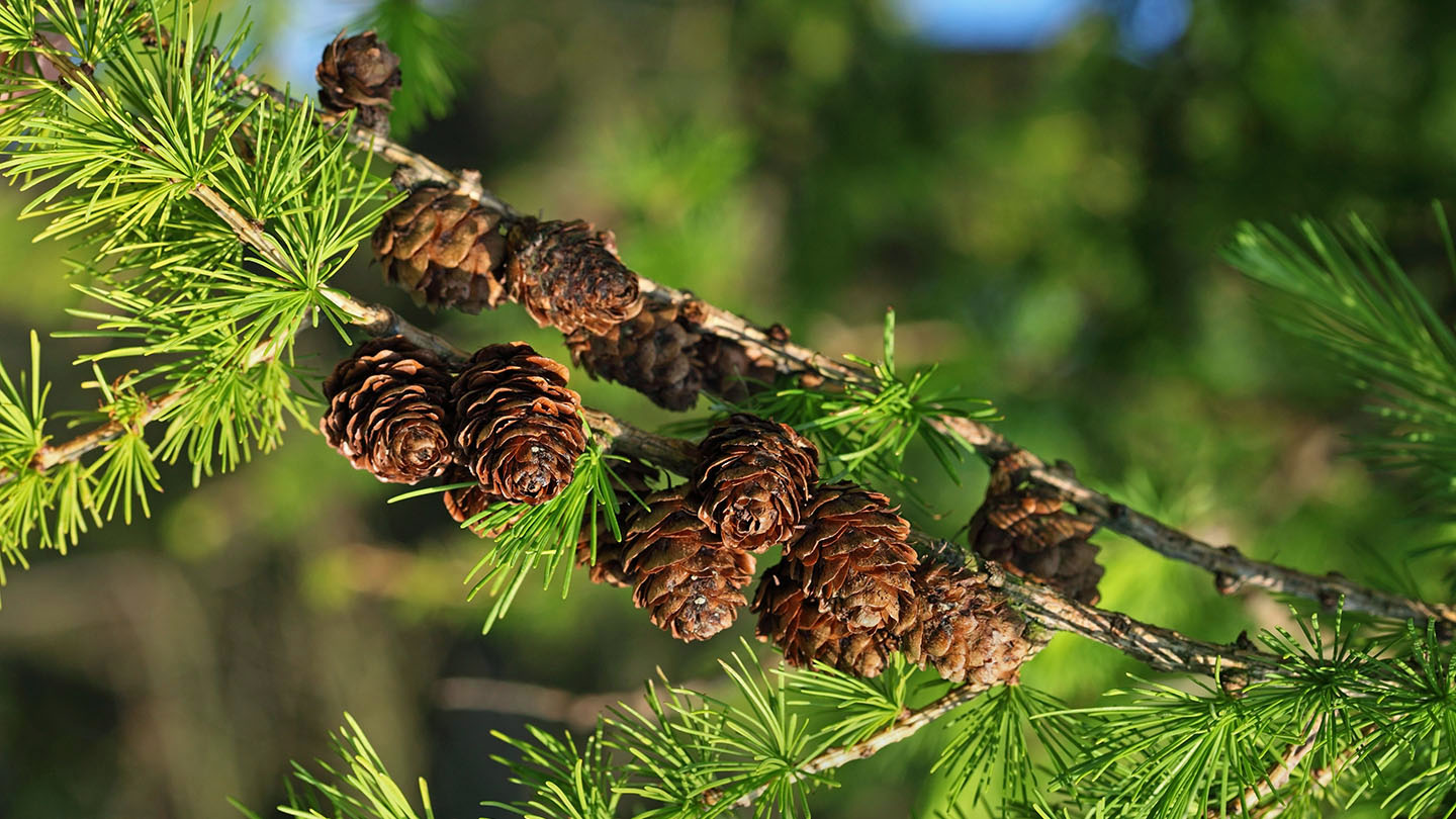 Larch trees can retain old cones on their stems for many years.