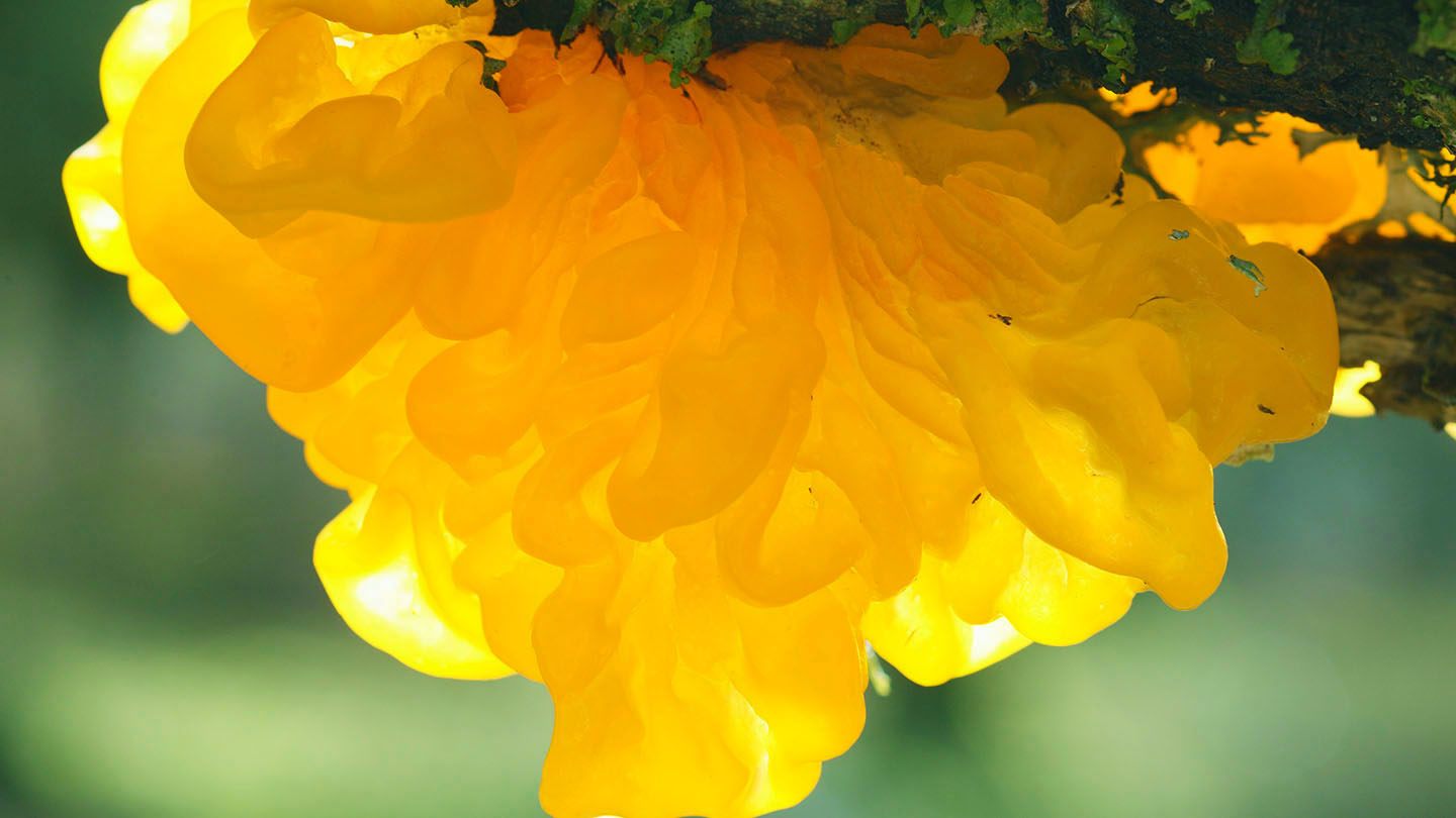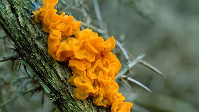Yellow brain fungus can be found throughout the UK and Ireland. It’s also been recorded in temperate regions in America, Asia and Australia. The best place to see it is on fallen branches of deciduous trees, gorse and other dead wood in woodland.