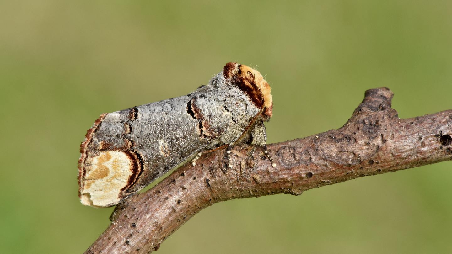 This cleverly camouflaged moth is banking on being mistaken for the shorn off end of a birch twig. Look for the straw-coloured areas at the ends of the wings and otherwise silvery colouration, plus the buff 'shoulders' at the front of the thorax. The wings are held close to the body giving the moth a somewhat cylindrical shape.